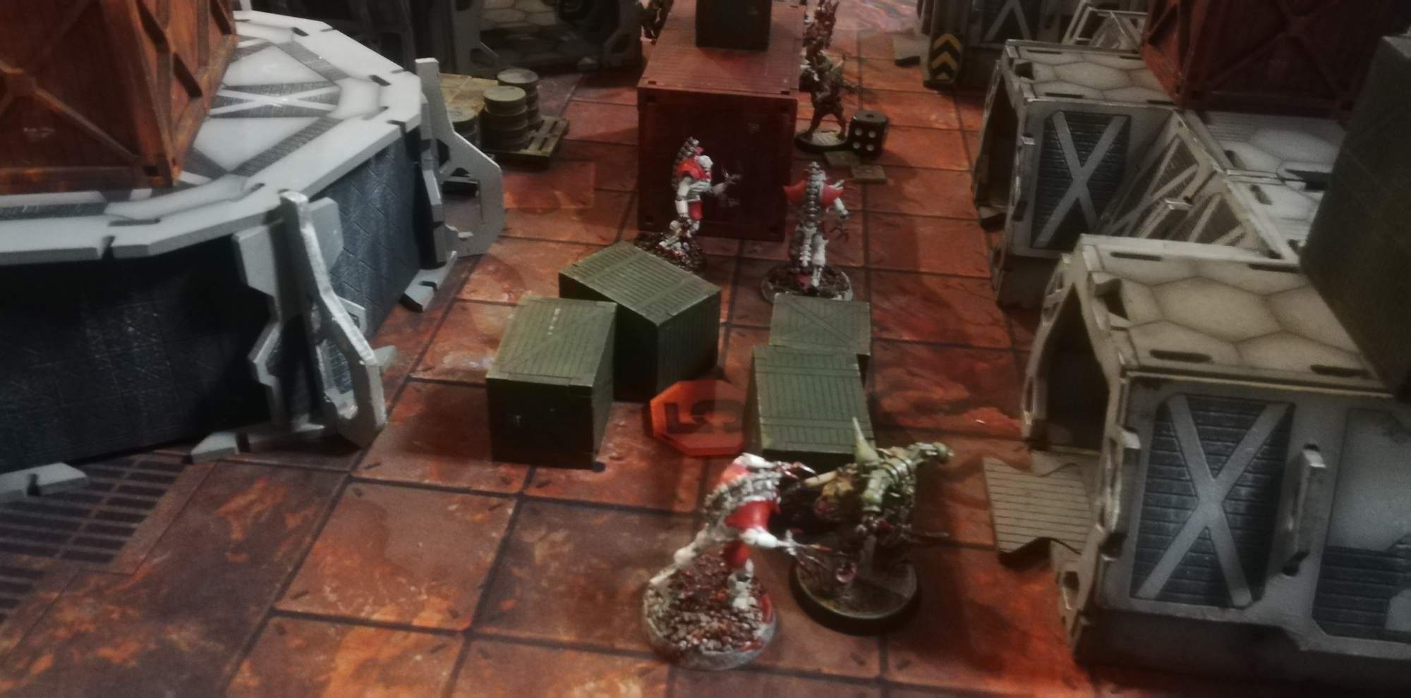 Prehrávam ini a súper ide dopredu, chargne poxa lychguardom (ten v 1. kole vyradil poxa čo bol decoy) aj napriek môjmu 3" ústupu. To ale nevadí. Rovnako chargne aj flayed one. Ja na oplátku hádžem do cc flailu a fistu. Výsledkom je mŕtvy pox a mŕtvy lychguard (zabila ho flaila, inury bol s rerollom). Streľba je opäť rozpačitá, cover a dlhá znamená, že si moc neurobíme, dostávam fleshku na poxa. .