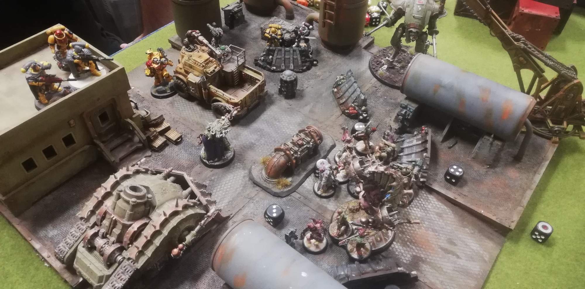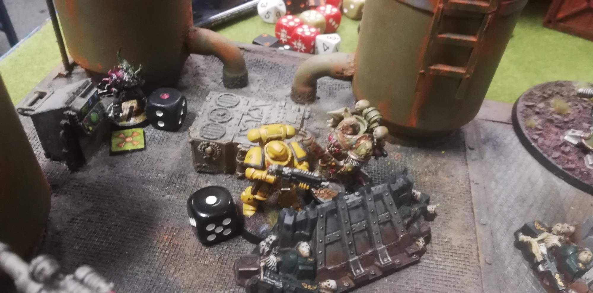 Fisti idú prví. Intercessor fallbackne od champa, ten ale sajvne prvú sniperku. Na oplátku odpaľuje intercessora prepálenou plasma pištoľou. Pox odoláva reiverovi. A na shaknutých poxov nedávam test, takže tam stoja ako drúci. V ďalšom kole odbehnem aj s champom, ak sa teda bude hrať. Ataker (súper) hádže na 5 kolo a ... padá ... 2ka. Game over.