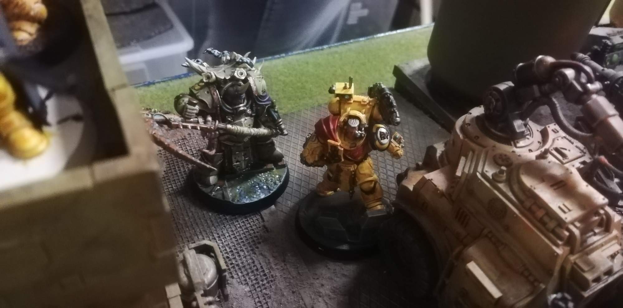 Zmestil som tam plague champa s fistou a plasma pištoľou, deathshrouda, 2x launcher a 8 poxov. Také aj na cc aj na streľbu aj na utekanie. Proti mne nastúpila zostava primaris mariňákov - 2x eliminátor, 1x intercessor seržo s fistou, 1x reiver a 2x intercessor. Budík sa rozostavil defezívne, sniperov a commsáka dal na strechu budovu, fističa do stredu a zvyšok na flank.