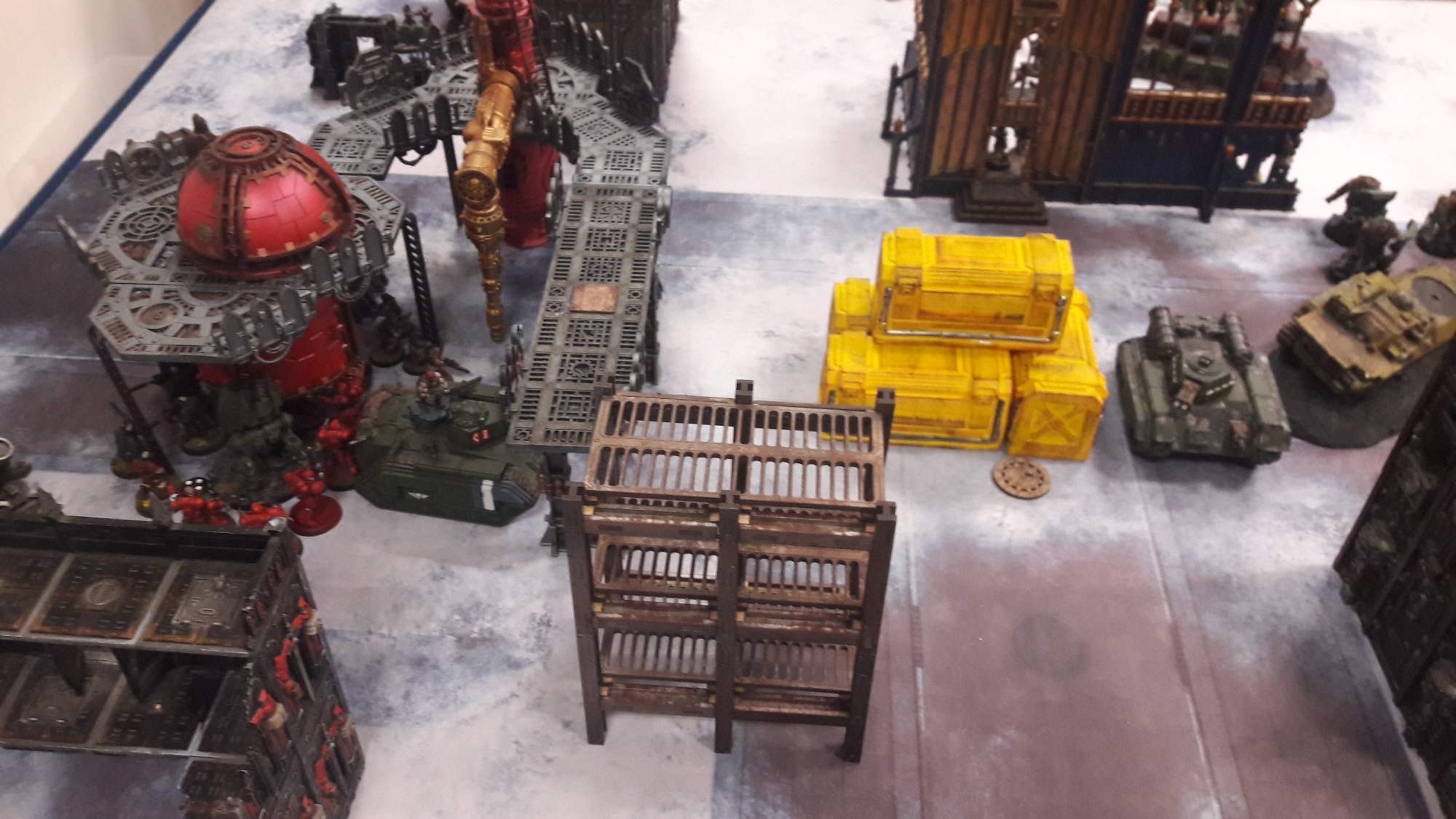 Hráme na objektivy (3vp za každý na konci hry) a aj kartičky (5 na ruke, jednu viem súperovi blokovať, keď zahrám kartu doťahujem do 5 na ruke). To vyzerá celkom zaujímavo. Rozložíme objektivy, vyhrávam hod na prvé kolo a deployneme sa. Dozadu dám basiho a hwt na stred pechotu a zvyšné tanky. Scionov do rezerv. Súper má dosť vecí v rezervách (chary a death company), zvyšok na stole pri objektivoch.