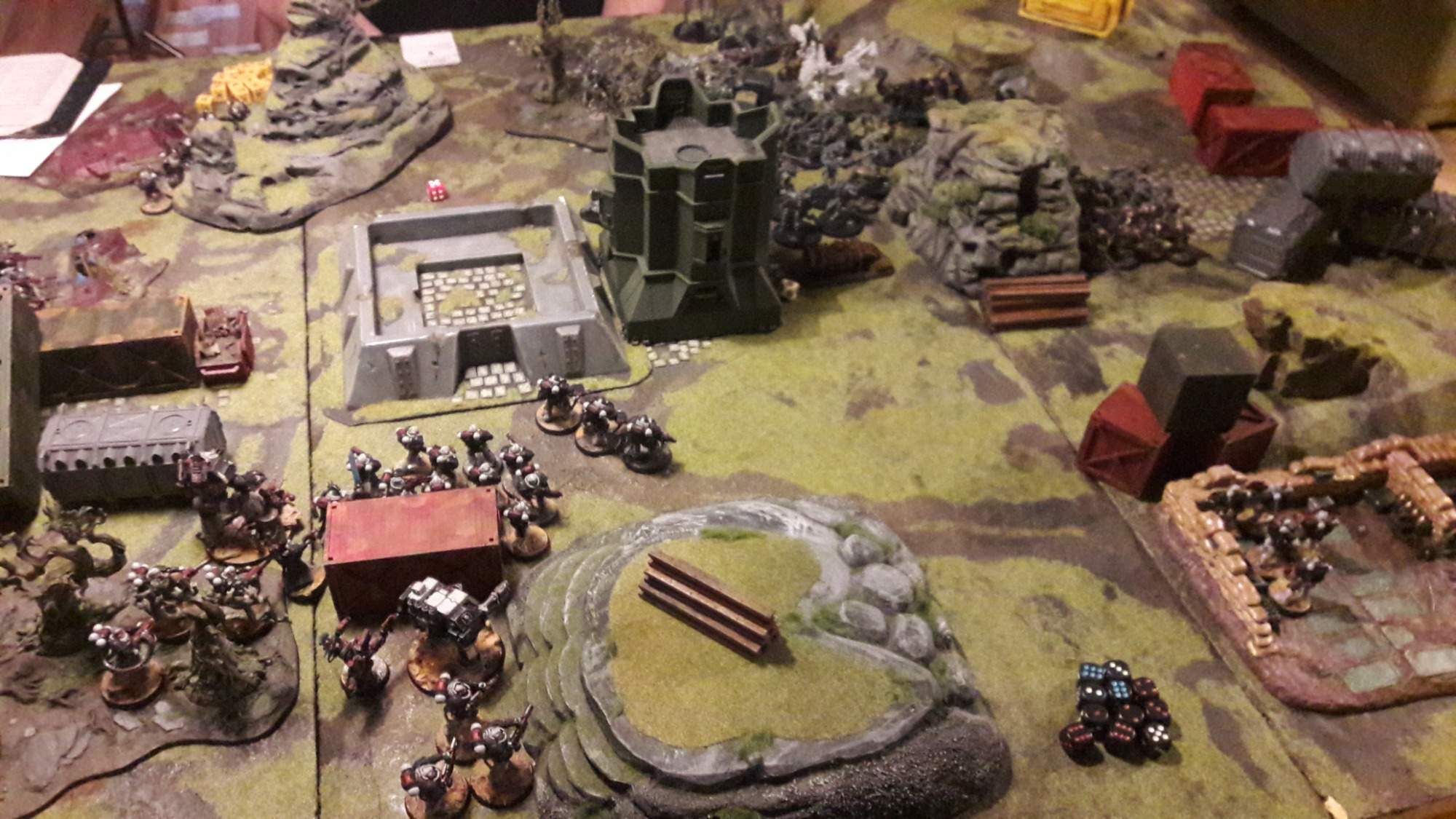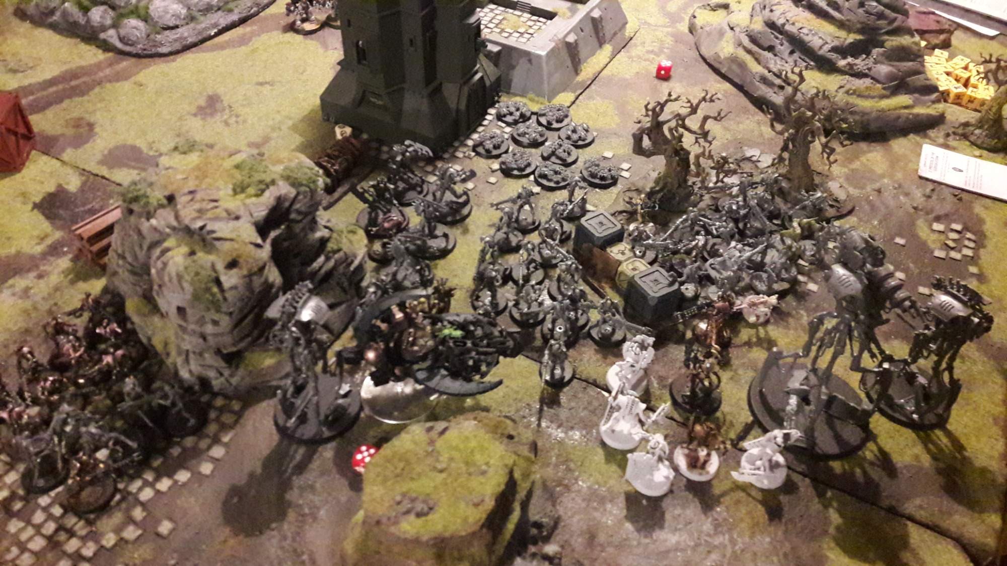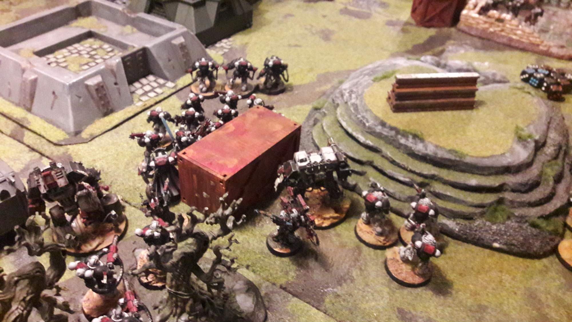 Falanga sa pohne vpred, veil of darkness je trochu uselless a nie je sa kam teleportovať. Jednotky zaujmú pozície a začne sa streľba. Wariory dole spolu s bargou popravia Infiltrátorov, na strede si vyžerú dakka dakka Agressory a nakoniec podľane aj ten posledný. Výrazne tomu napomohol aj 1 Doomstalker.